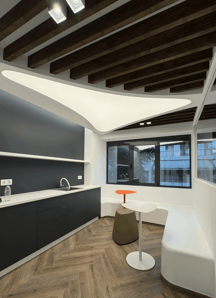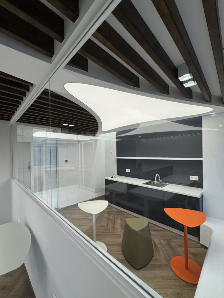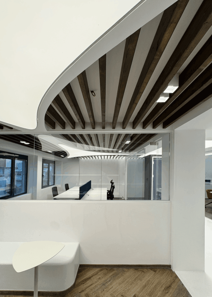An organic composition shapes the workspace: curved plaster soffits sweep across the ceiling, intersecting with solid timber beams that add structure, warmth, and acoustic control. Integrated linear LEDs follow the curves, washing light evenly and guiding movement. Clear glazing keeps the plan open and connected, while a herringbone wood-look floor grounds the space with a durable, easy-care finish. The result is a calm, contemporary environment where soft geometry meets crafted detail.