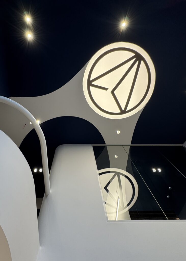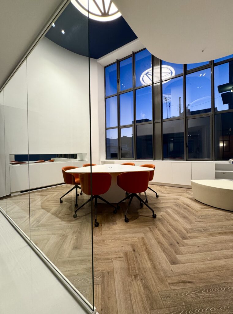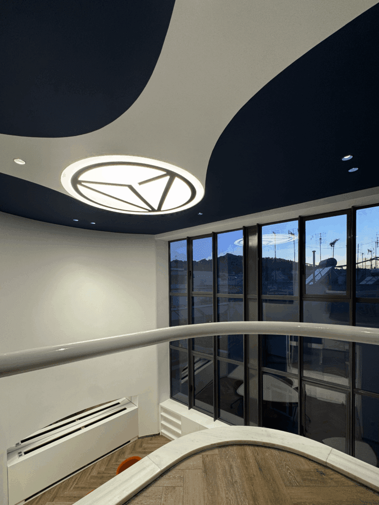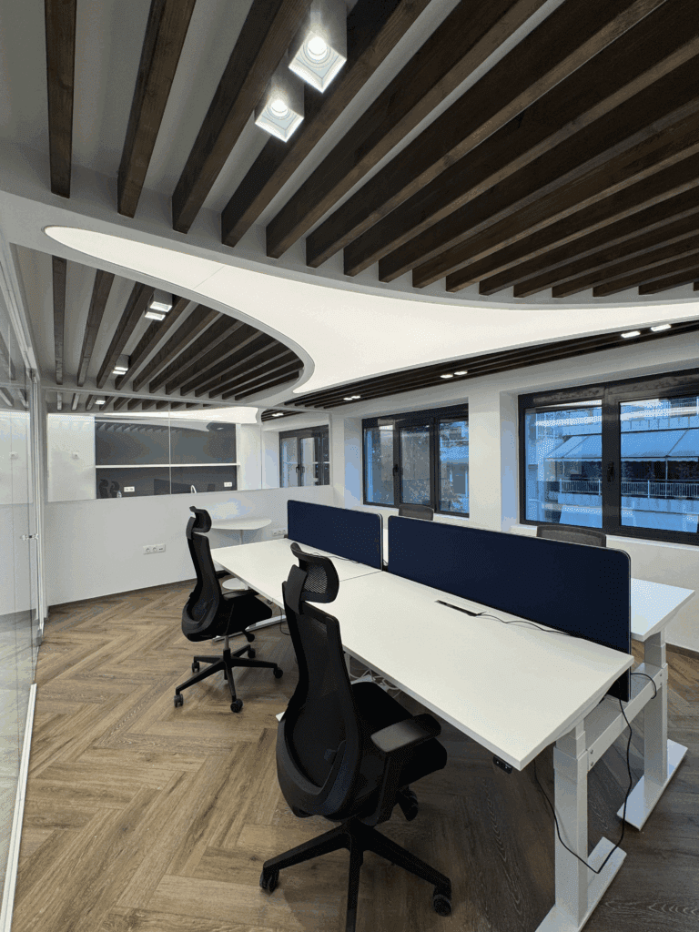 Within a landmark Intracom building, we redesigned the Athens workspace for AFRY, the international Swedish company advancing green energy. The scheme organizes a double-height volume with flowing curves, a sculpted mezzanine, and full-height glazing that visually links collaboration areas and focused workstations. Monochrome ceilings with bespoke luminous discs provide even, low-glare lighting and guide circulation, while herringbone wood flooring and warm upholstery soften the high-tech palette. A compact meeting suite and agile benching support hybrid work, bringing clarity, transparency, and a contemporary identity aligned with AFRY’s sustainable ethos.