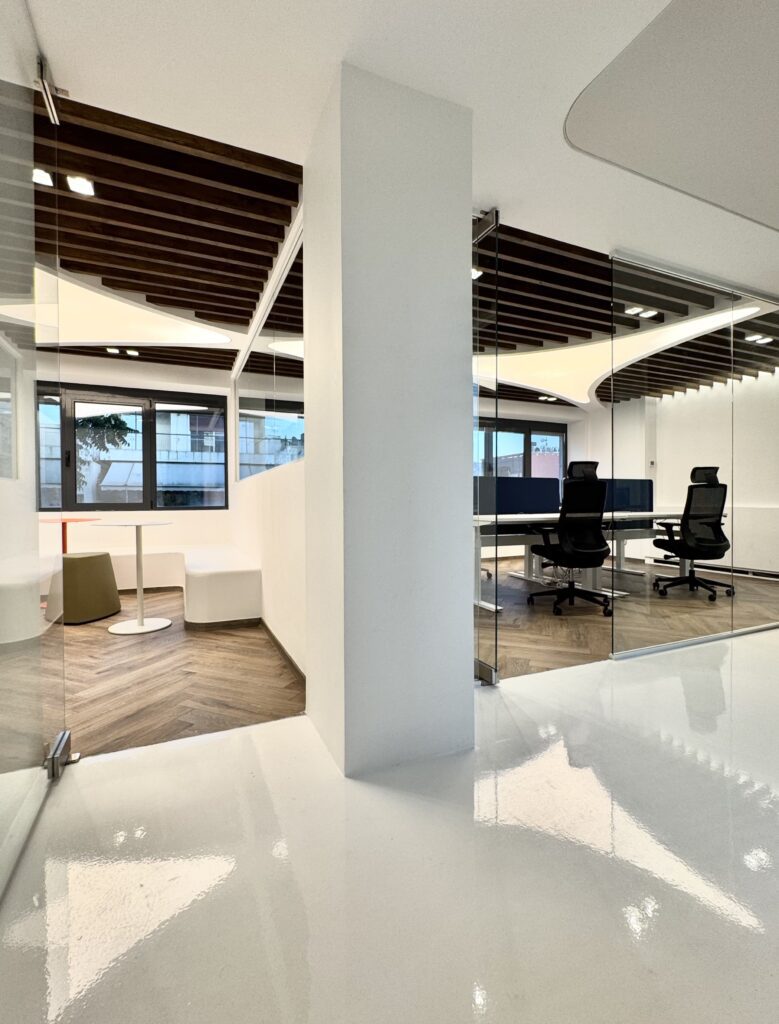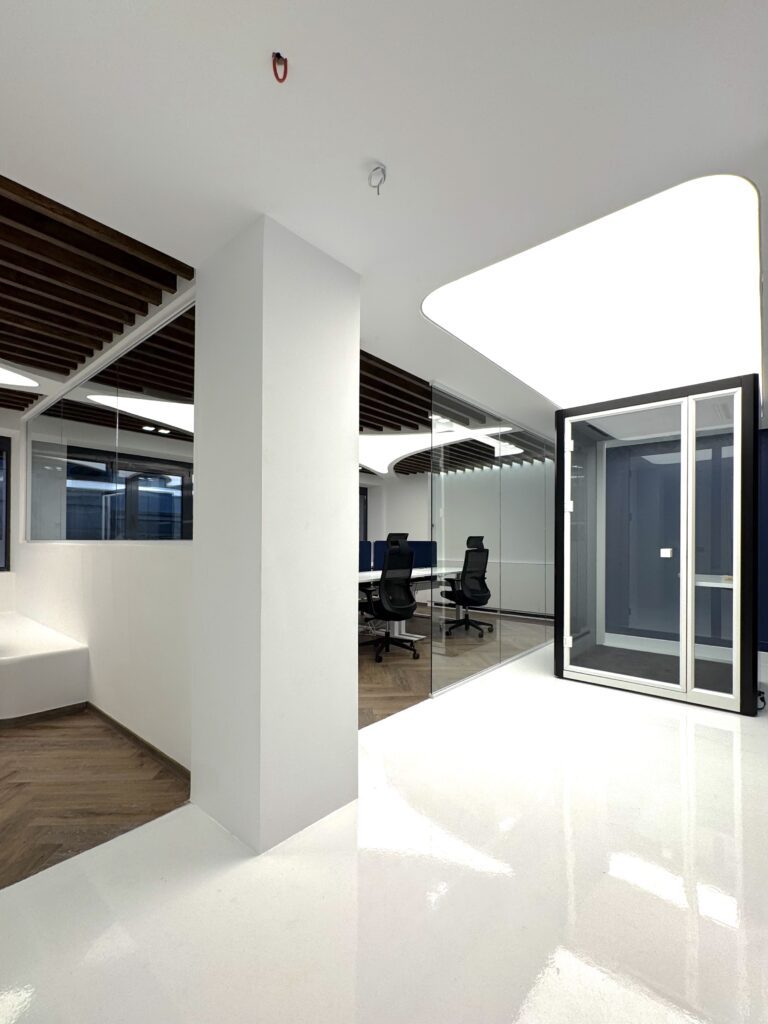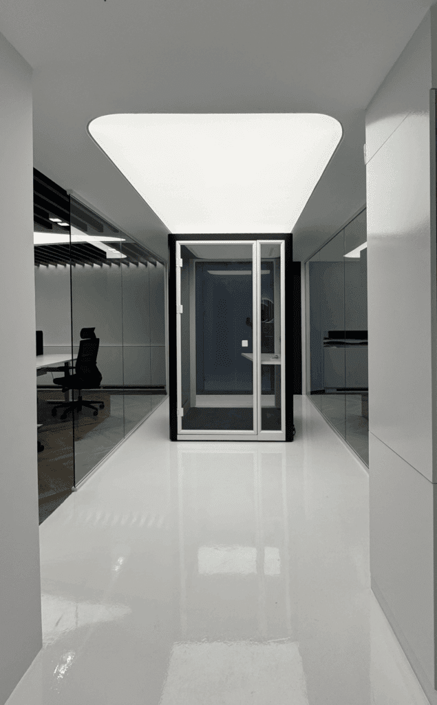 A sculpted ceiling pocket with perimeter LEDs delivers soft, glare-free illumination and guides movement along the corridor. At the axis, an acoustic phone-booth offers a private zone for sensitive calls or video without disrupting the open plan. Underfoot, a seamless white epoxy floor (high-gloss, high-build) provides a durable, hygienic, easy-to-clean surface that boosts brightness through light reflectance.
