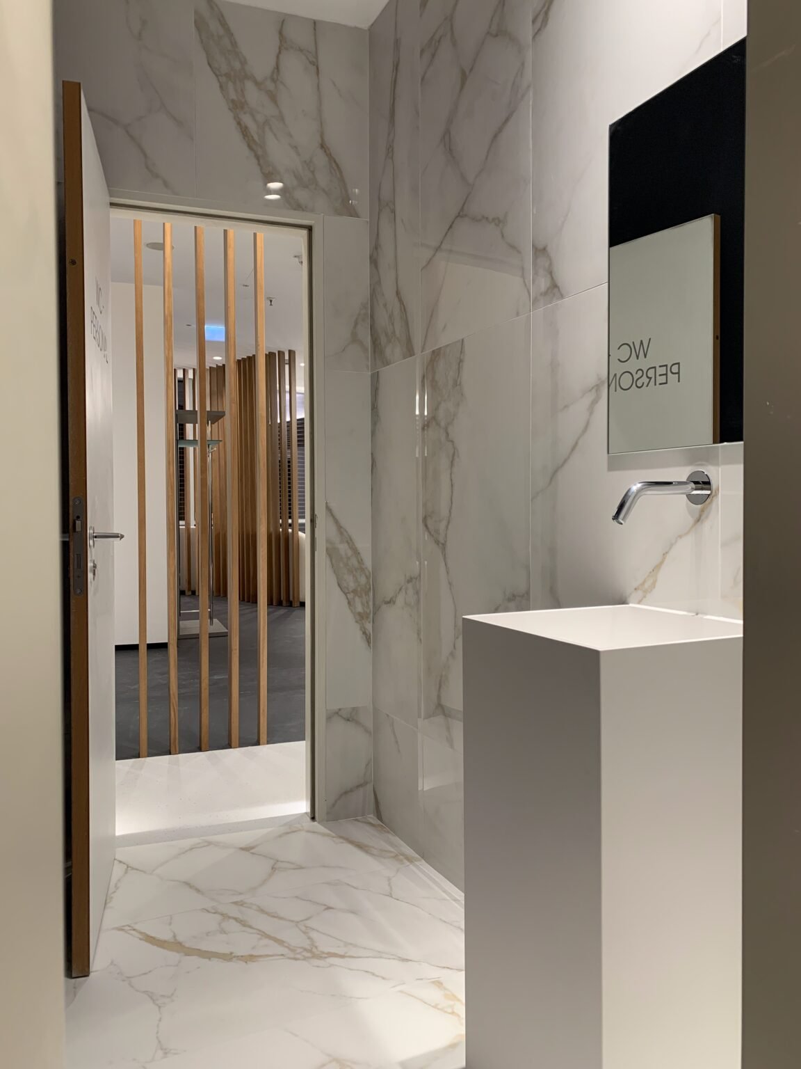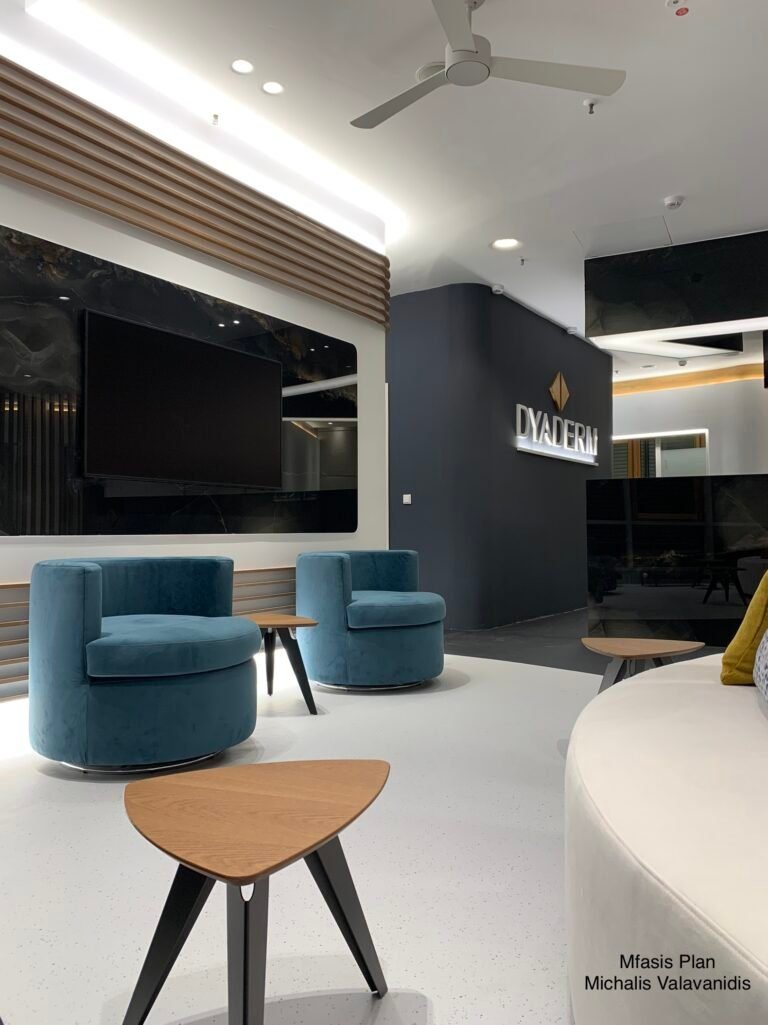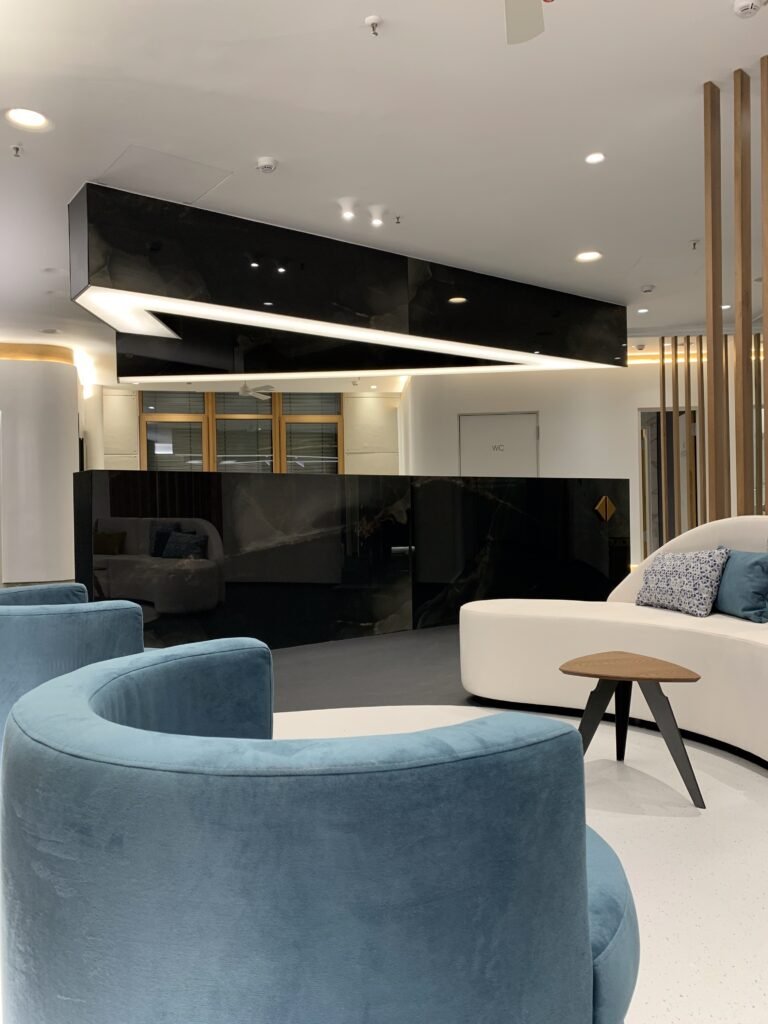 The waiting areas are defined by custom-made curved constructions designed to enhance flow and comfort. Soft seating elements follow organic lines, creating a welcoming and contemporary atmosphere. The flooring consists of high-resistance PVC, selected specifically for clinical use to ensure durability and hygiene. Vertical wooden slats serve as elegant dividers, adding warmth and rhythm to the space while maintaining openness and visual continuity.