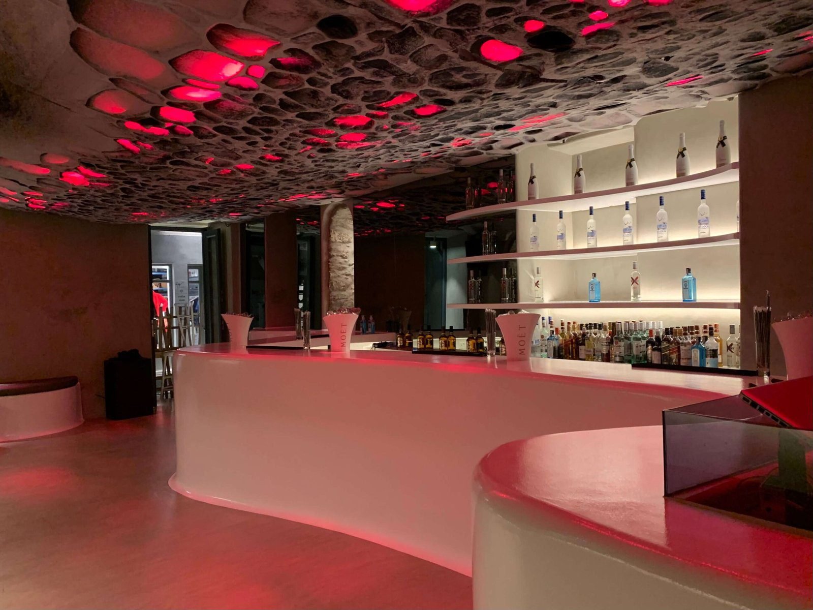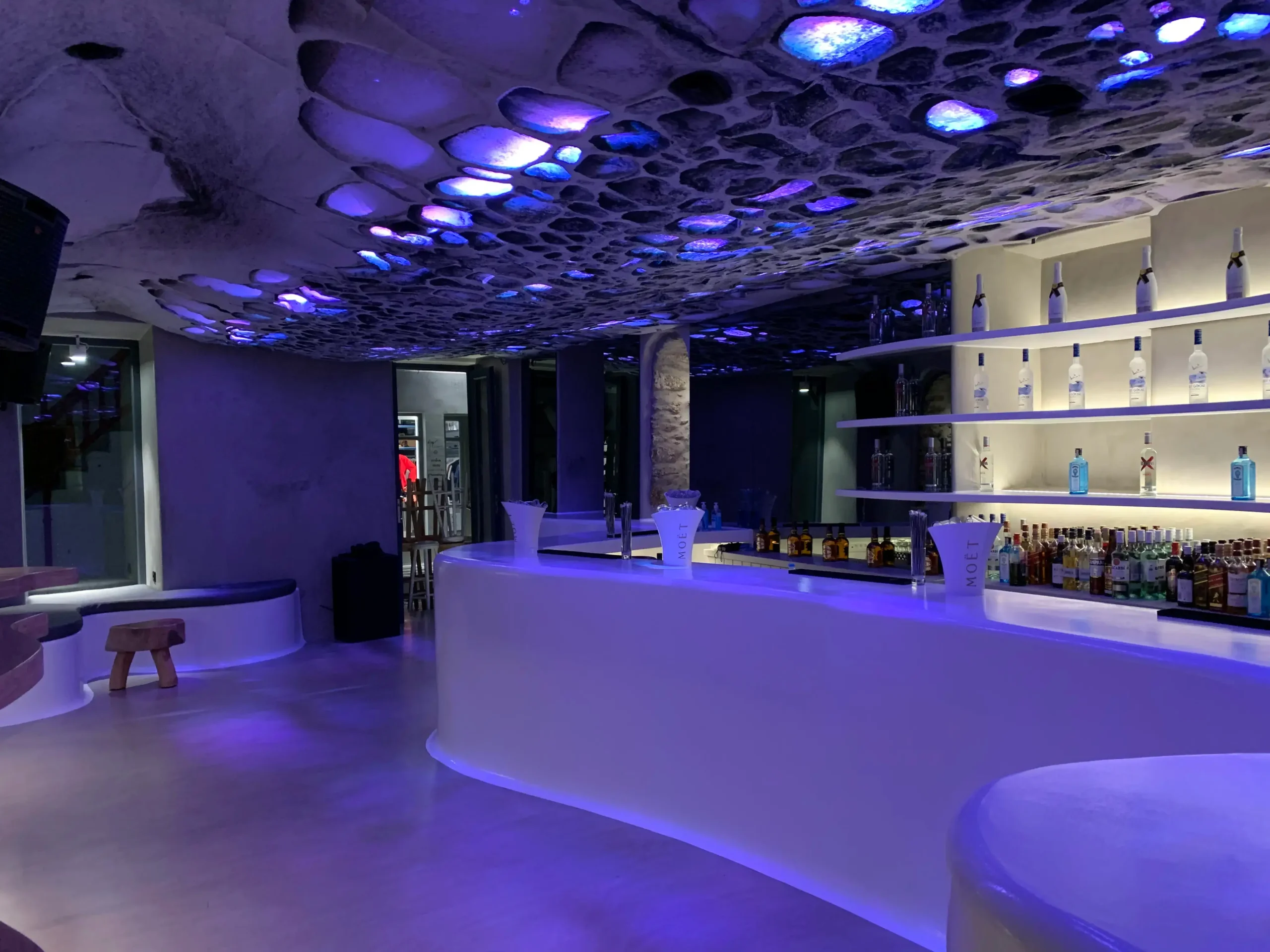 Drawing from this element, we aimed to merge the rigidity of stone with the curved motion of waves and the spontaneous construction lines typical of the Cycladic vernacular. Every feature within the space follows soft, elastic curves — from the built-in bar and flowing wooden stands to the sculpted shelving that echoes the sea’s rhythm.