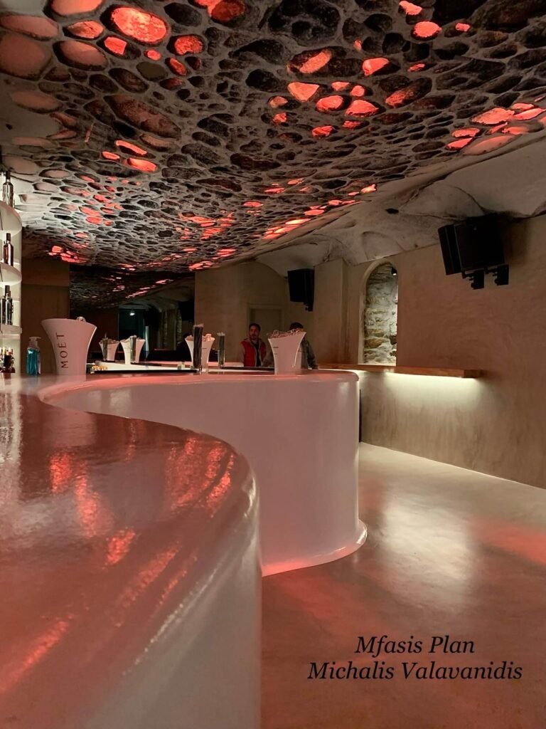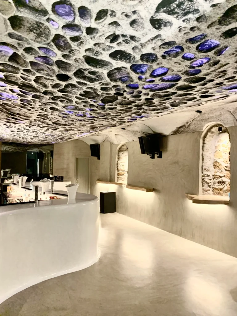 Drawing from this element, we aimed to merge the rigidity of stone with the curved motion of waves and the spontaneous construction lines typical of the Cycladic vernacular. Every feature within the space follows soft, elastic curves — from the built-in bar and flowing wooden stands to the sculpted shelving that echoes the sea’s rhythm.