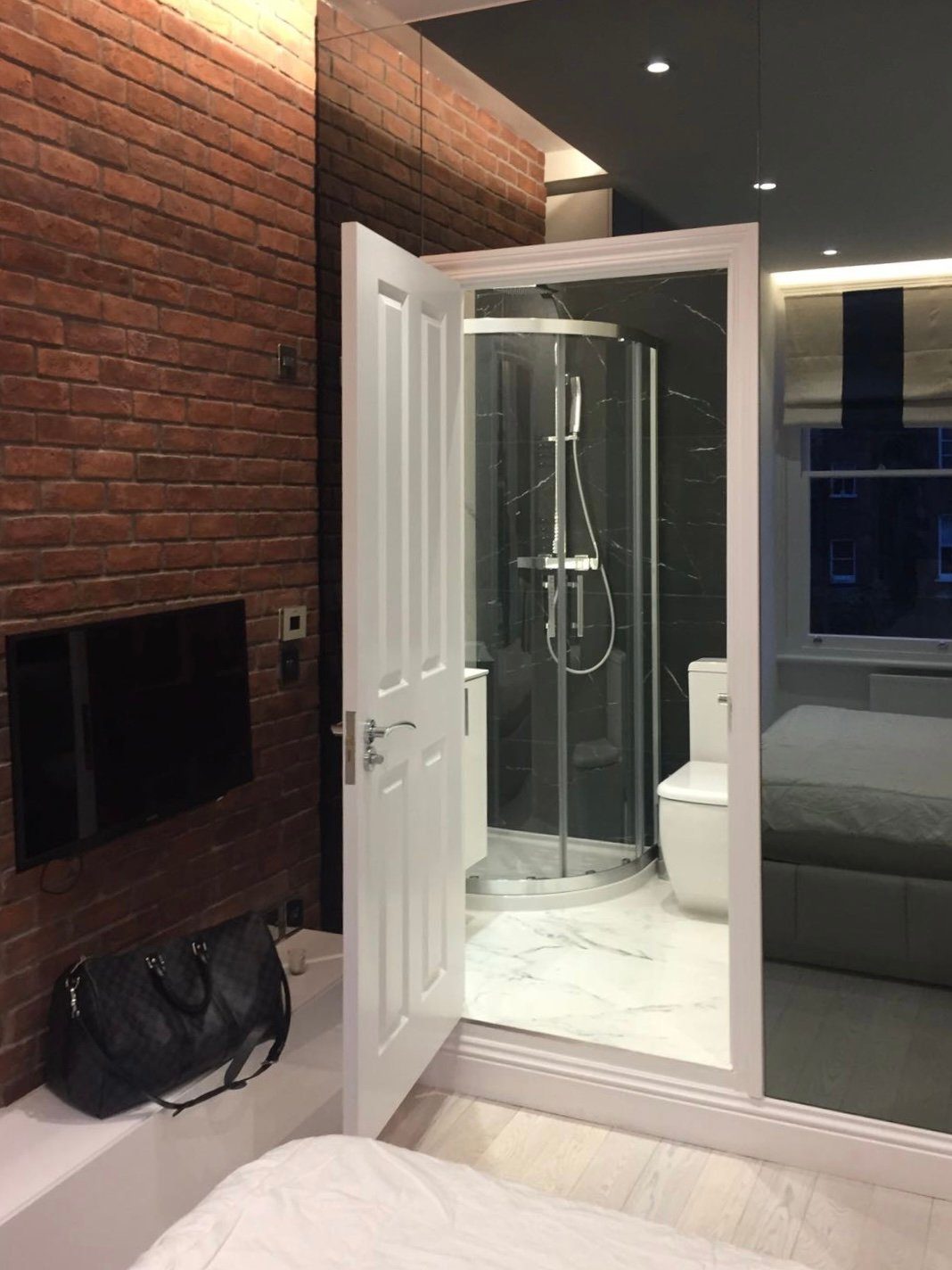 This compact en-suite bedroom combines functionality with refined material contrasts. The exposed brick wall introduces a warm, industrial tone, balanced by clean white framing and recessed ceiling lighting that enhance depth and brightness. The glass shower enclosure and dark stone cladding bring a contemporary touch to the bathroom area, visually extending the space. Custom finishes and neutral tones create a seamless transition between sleeping and bathing zones, emphasizing a sense of urban sophistication within limited dimensions.