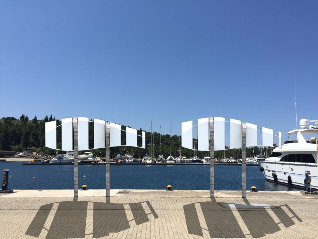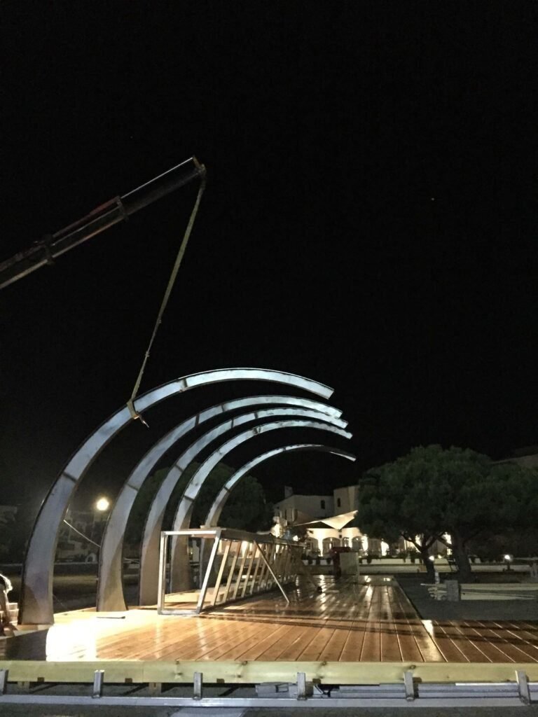 Each metal arch is precisely engineered to convey both lightness and structural integrity, creating a spatial rhythm that echoes the motion of waves and the silhouette of a yacht’s hull.