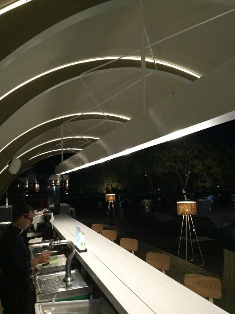 A contemporary architectural intervention located in the Marina of Porto Carras, designed with fluid, ship-inspired curves and metallic structural forms that echo the silhouette of a yacht.