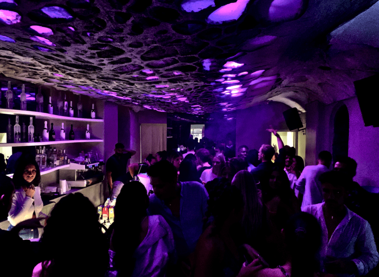 A series of curved steel frames rise rhythmically above the bar, forming a sculptural canopy that defines the lounge’s identity.