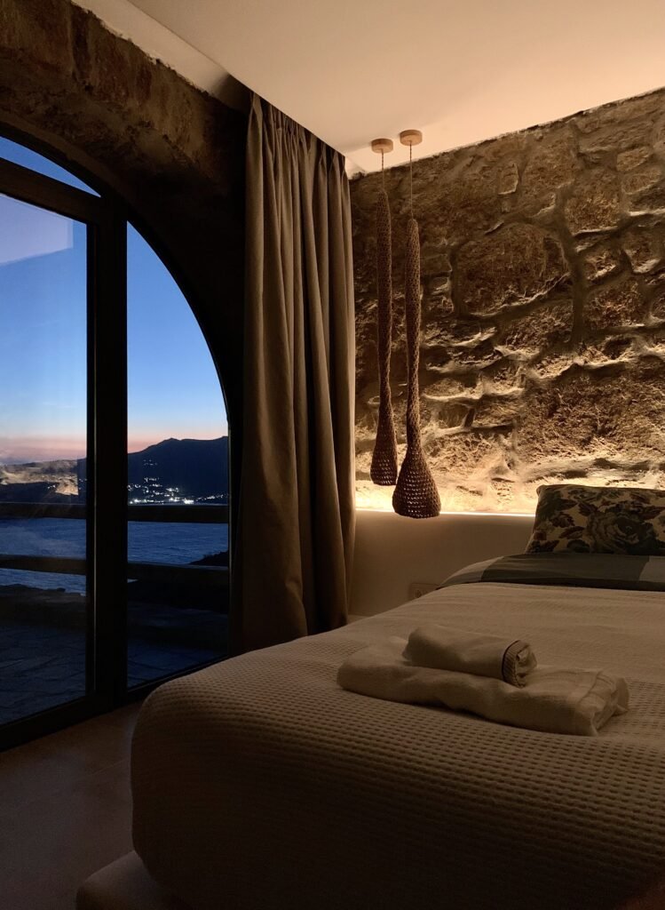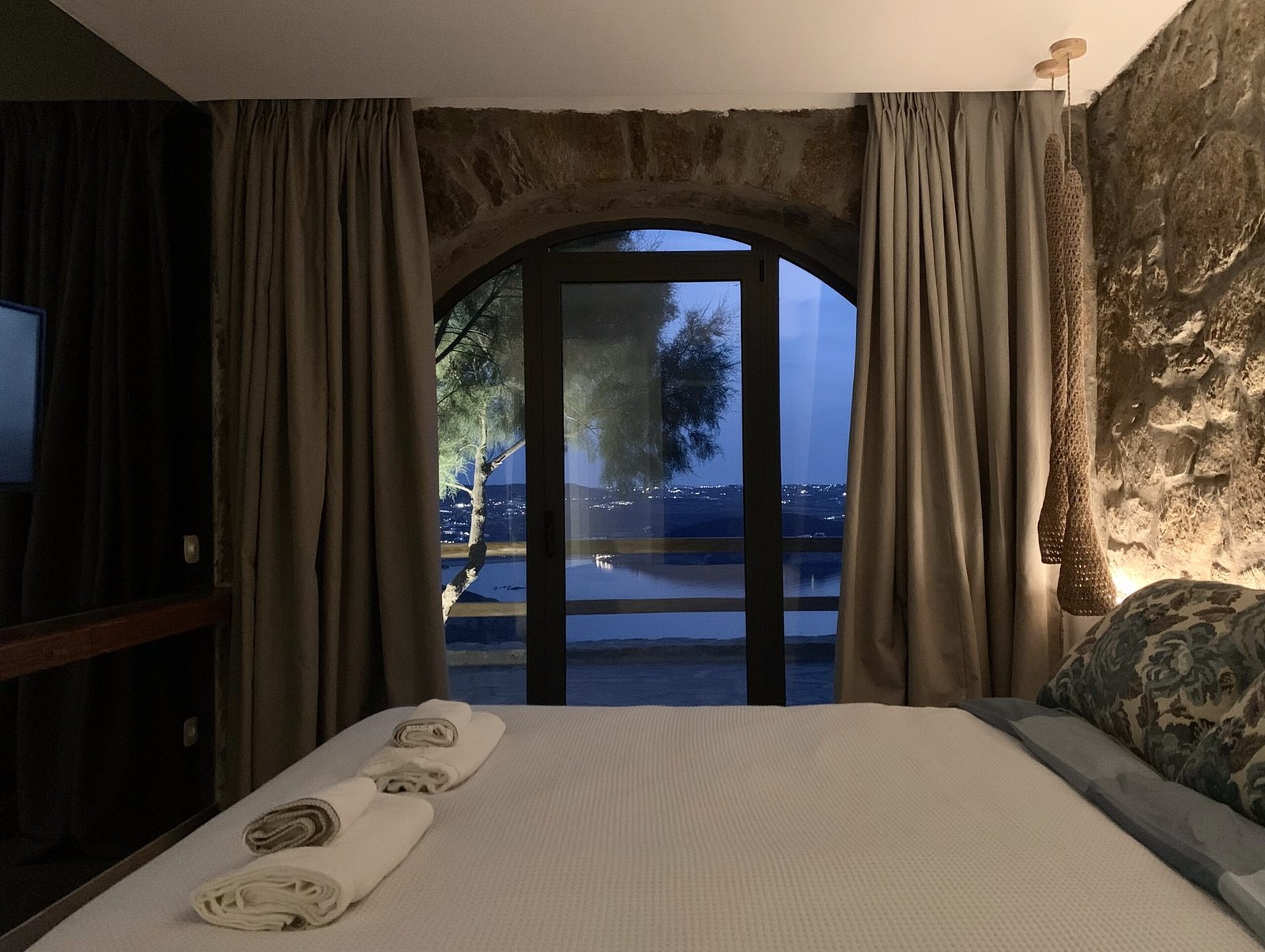 Large arched openings connect the bedroom to the surrounding landscape, framing views of the sea and the evening horizon. Where tradition meets serene modern living.